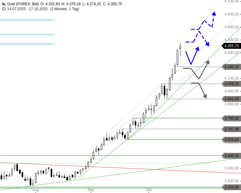 Rückblick: Mit dem Ausbruch aus dem steilen Aufwärtstrendkanal der letzten Wochen gelang dem Goldpreis eine weitere Dynamisierung der Rally, die am vergangenen Montag auch über das Allzeithoch bei 4.059 USD und damit über das Kursziel bei 4.070 USD führte. Im gestrigen Handel wurde sogar die 4.270-USD-Marke überwunden und damit der Weg an das nächsthöhere große Projektionsziel bei 4.375 USD geebnet. Die Marke wurde heute Nacht erreicht und direkt zur Bestätigung ihrer Bedeutung eine scharfe Korrektur bis 4.274 USD begonnen. Diese wurde am frühen Morgen wieder aufgefangen.