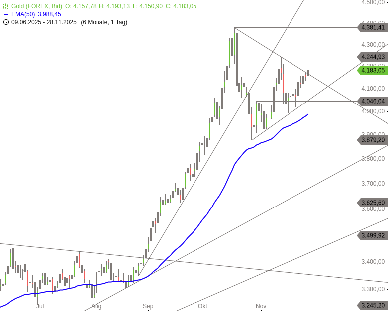Nach dem neuen Allzeithoch bei 4.381 USD ist der Goldpreis in den vergangenen Wochen in eine Konsolidierung übergegangen. Dabei wurde der EMA 50 nach einem Zwischentief bei 3.879 USD mehrfach erfolgreich verteidigt. Innerhalb der stabilen Seitwärtsbewegung bildete sich zudem ein kleines symmetrisches Dreieck.