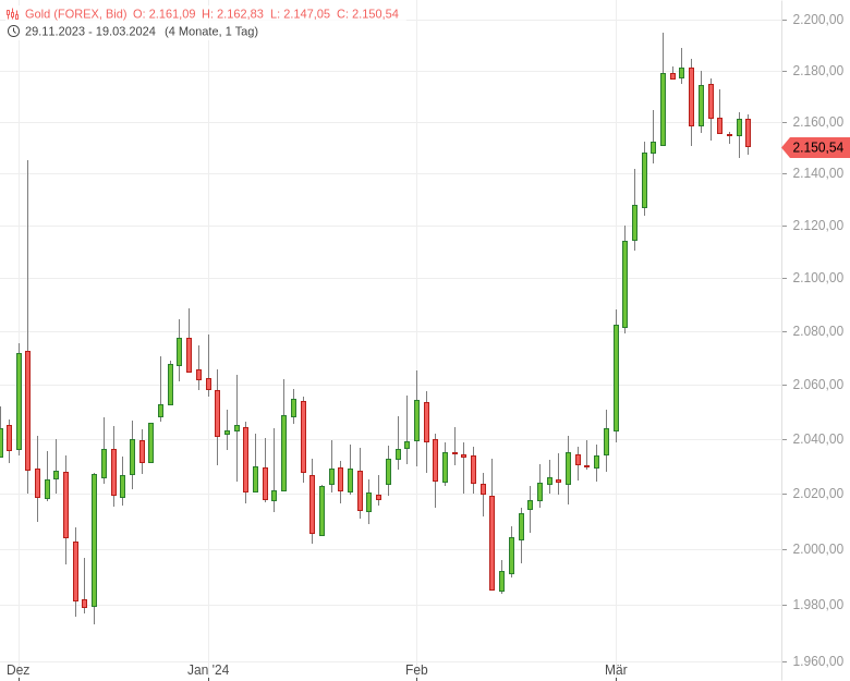 Gold hatte in den vergangenen Wochen kräftig von der Erwartung profitiert, dass die Fed zur Jahresmitte beginnen wird, ihre Leitzinsen zu senken zu senken und am 8. März infolge dessen bei 2.195,09 US-Dollar je Feinunze ein frisches Allzeithoch erreicht. Zuletzt hat diese Erwartung jedoch angesichts der hartnäckig oberhalb des zweiprozentigen Inflationsziels der Fed liegenden US-Verbraucherpreisinflation einen Dämpfer erhalten, so dass Gold zurückfiel.