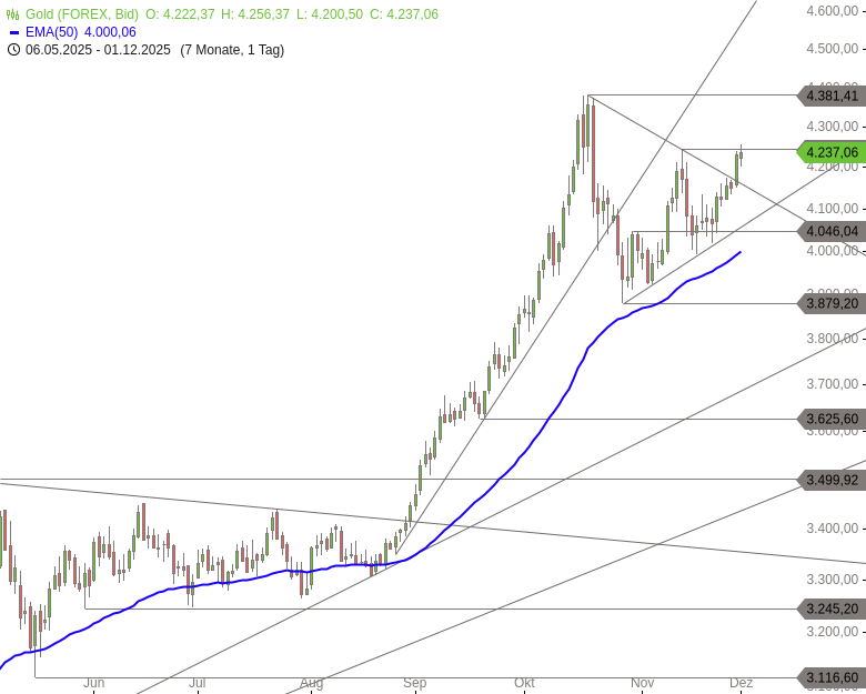 Der Goldpreis konsolidierte ab Ende Oktober den vorausgegangenen Anstieg auf das Verlaufshoch bei 4.381 USD. Nach einem Zwischentief bei 3.879 USD bildete sich in den Folgewochen eine kleine symmetrische Dreiecksformation aus. Seit Ende der vergangenen Woche lösen sich die Notierungen aus dieser Formation nach oben.