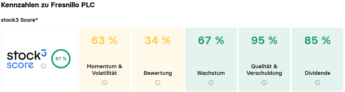Im stock3 Gesamtscore schneidet Fresnillo mit 97 % übrigens weiterhin extrem gut ab. Der Teilscore Momentum & Volatilität hat sich inzwischen allerdings auf nur noch leicht überdurchschnittliche 63 % abgekühlt. Dabei wirken sich vor allem der inzwischen auf fast 25 % angewachsene Abstand vom 52-Wochen-Hoch und die stark erhöhte Volatilität negativ aus, während die 6- und 12-Monats-Performance weiterhin stark überdurchschnittlich hoch sind.