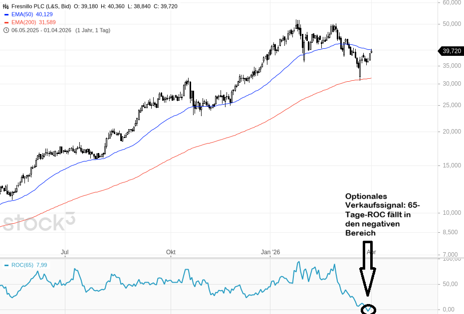 Nach dem Peak der Edelmetallpreise im Januar 2026 korrigierte auch Fresnillo. Das Kursmomentum trübte sich deutlich ein und die Rate of Change (ROC) mit einer Periodendauer von 65 Tagen, die von mir als optionales Verkaufssignal sowohl im Trendfolge- und Momentum-Depot als auch im Score-Depot beachtet wird, fiel kurzzeitig in den negativen Bereich. Das gab den Anlass für den Verkauf am Montag.