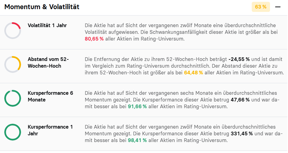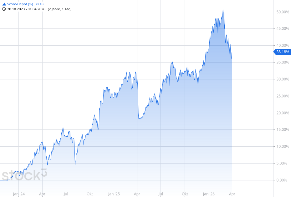 Der Einstieg kam im Mai 2025 nicht zufällig zustande. Für das Score-Depot wird in fundamental aussichtsreiche Aktien investiert, die zudem über starkes Kursmomentum verfügen. Die Aktienselektion erfolgt auf Basis des stock3 Scores, der 30 fundamentale und quantitative Kriterien vollautomatisch auswertet, um gute Aktien zu finden. Für das Score-Depot investiere ich in Aktien, die einen hohen Gesamtscore und einen hohen Teilscore Momentum & Volatilität vorweisen können.