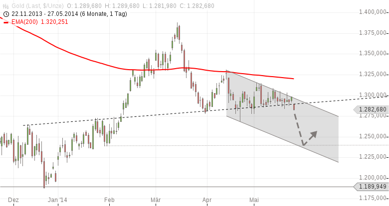 Heute bricht der Goldpreis erneut die entscheidende Unterstützungslinie (gestrichelt), die seit Dezember 2013 Bestand hat. Der Handelstag hat noch einige Stunden. Wenn im Goldpreis kein Reversal mehr zustande kommt, liegt im ersten Schritt ein charttechnisches Verkaufssignal mit Ziel 1.238 $ vor. Diese Entwicklung kann abgewendet werden, wenn sich Gold nun rasch wieder stabilisieren würde.