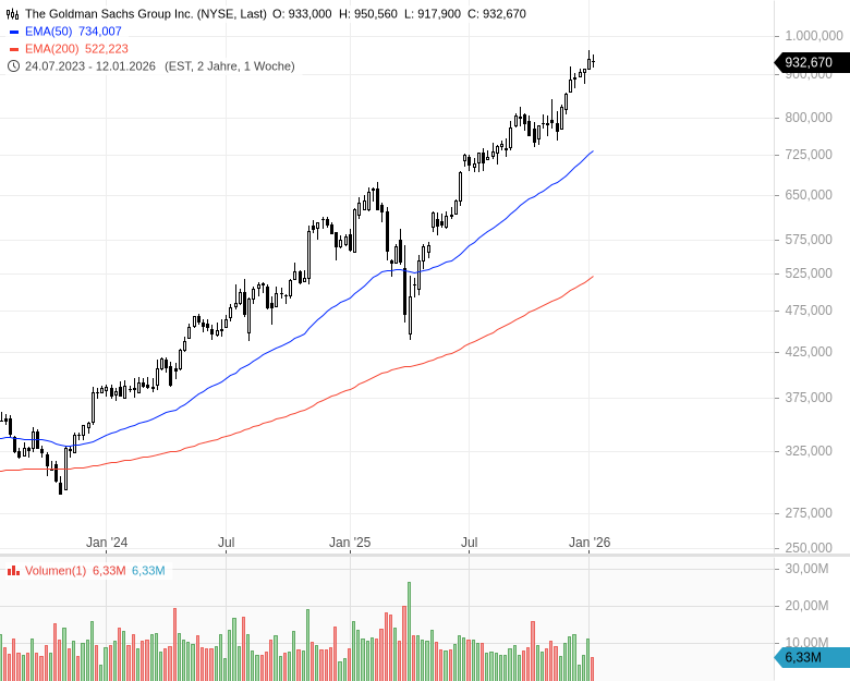 Fazit: Reicht es noch bis zur 1.000-USD-Marke bei der Goldman-Sachs-Aktie? Vorbörslich sieht es nicht danach aus. Die Bewertung ist auch nach dem Lauf nicht vollends abgehoben. Dass GS das Sahnejahr 2025 mit einem Gewinnanstieg von 27 % 2026 wird toppen können, davon gehe ich aber nicht aus. Korrekturen abwarten!