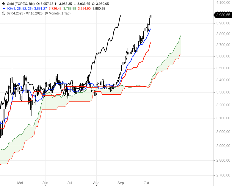 Nach dem Ichimoku-Trendfolgesystem liegt im Goldpreis weiterhin ein perfekter Aufwärtstrend mit fünf von fünf möglichen bullischen Signalen vor: