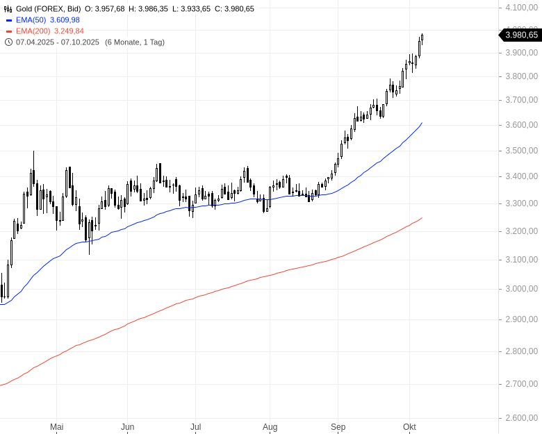 Der "sichere Hafen" Gold ist angesichts des Haushaltsstreits in den USA und der Aussicht auf weitere Zinssenkungen durch die Notenbank Fed weiter gefragt. An der Terminbörse Comex überschritt der Goldpreis-Future am Dienstag erstmals die Marke von 4.000 USD, während der Spotpreis zuletzt weiter leicht darunter notierte.