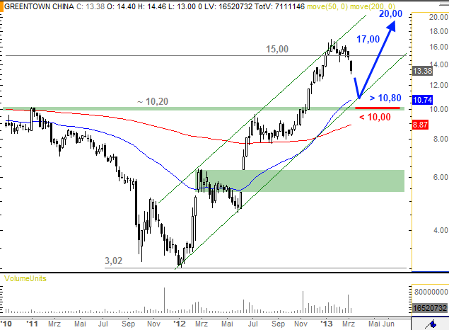 Im Hinblick zur Analyse des vergangenen Jahres vom 14. November 2012 (hier klicken) erfüllte das chinesische Immobilienunternehmen Greentown China die Erwartungen. Die Zielmarke von 15,00 $ wurde sogar überboten mit einem Verlaufshoch bei exakt 17,00 $. Seit diesem Hoch tropft der Kurs jedoch zunächst leicht, nunmehr stärker nach unten und unterschreitet während dieser Woche die Marke von 15,00 $ recht deutlich. Die deckelnde obere Aufwärtstrendlinie stoppte zudem weitere Impulse, so dass es jetzt durchaus zu einem Rücklauf bis zur unteren Aufwärtstrendlinie bei rund 10,80 $ kommen könnte. Von dort ausgehend besitzt der Wert wieder einiges an Potenzial in Richtung von 17,00 bzw. gar 20,00 $.