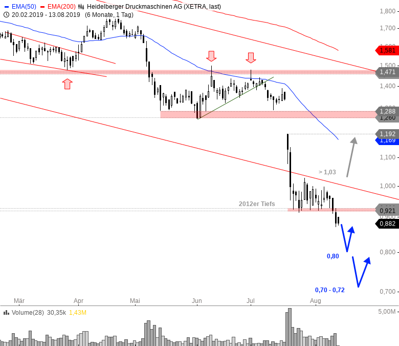 Mit der Senkung der Gewinnprognose im Juli kam es zu einer starken Verkaufswelle, welche zum Einbruch an die 2012er Tiefs bei 0,921 - 0,928 EUR führte. Dort versuchte sich der Wert zuletzt zu stabilisieren. Der Durchbruch nach unten erzeugt nun frische Verkaufssignale. Weitere Abgaben in Richtung 0,80 und später 0,70 - 0,72 EUR könnten folgen.