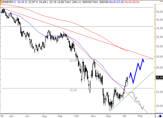 Rückblick: Am Montag dieser Woche gelang den Aktien von Heineken der Ausbruch über den Widerstand bei 22,59 Euro. Damit zeigt sich in der Aktie nun ein kurzfristiger Aufwärtstrend mit seinen klassischen höheren Hochs und Tiefs. Unterstützt wird dieses bullische Chartbild durch den Ausbruch über die seit September letzten Jahres federführende Abwärtstrendlinie, mit dem die jüngste Verkaufswelle von 33,60 Euro bis auf 19,32 Euro beendet ist.