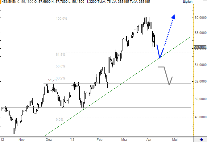 Überzeugen konnte die Vorstellung der Käufer in den letzten Monaten in der Heineken Aktie, die sich bis auf 60,20 Euro verteuerten. Hier kam es ab Ende März zu Gewinnmitnahmen, die die Aktie in eine Korrektur trieben. Der kurzfristige Verkaufsdruck hält dabei auch heute an und so wären weitere Verkäufe bis auf 55,50 – 54,15 Euro nicht ausgeschlossen. Hier stößt die Aktie jedoch auf einen guten Unterstützungsbereich, der für eine neuerliche Stabilisierung sorgen könnte. Gelingt dies, wäre eine Kaufwelle bis auf 60,20 Euro möglich.