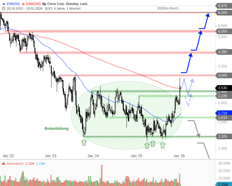 Dabei dürften die Preisbereiche bei 2,40 und 2,23 USD stützen. Auch tiefe Pullbacks bis 1,93 USD oder zum steigenden EMA50 wären denkbar. Erst ein nachhaltiger Rückfall unter 1,56 USD würde das große Rallyszenario gefährden, dann müsste ein Test des zentralen Supports bei 1,15 - 1,21 USD eingeplant werden.