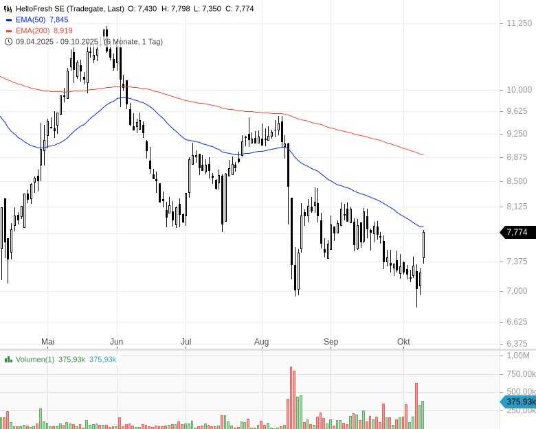Im frühen Handel legten die Titel des Kochboxenversenders um rund 10 % zu und führten damit den MDax an. Ausschlaggebend für den Kurssprung war eine Hochstufung durch die UBS: Die Schweizer Großbank änderte ihre Bewertung von "Neutral“ auf "Buy“ und hob das Kursziel deutlich von 7,60 EUR auf 10,80 EUR an.