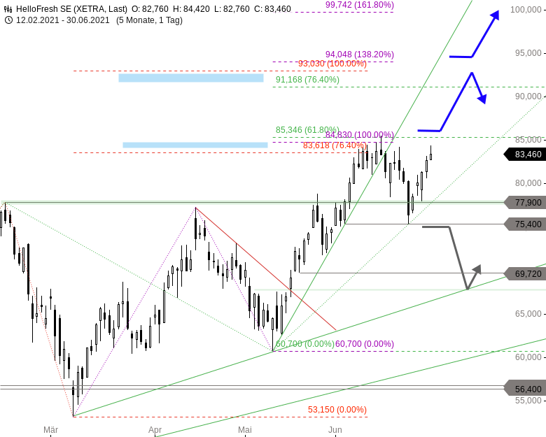 Und diesmal stehen die Chancen auf einen Ausbruch sehr gut. Nachhaltig wäre dieser gelungen, wenn die Aktie auch über 85,75 EUR klettern kann. Damit wäre weiteres Potenzial bis 88,00 EUR und darüber bereits bis an die Zielzone von 91,16 bis 93,00 EUR generiert. Sollte sich die Rally der Aktie von Hellofresh dann nochmals beschleunigen und auch über das Kursziel bei 94,04 EUR führen, könnte sogar die 100,00 EUR-Marke fallen.