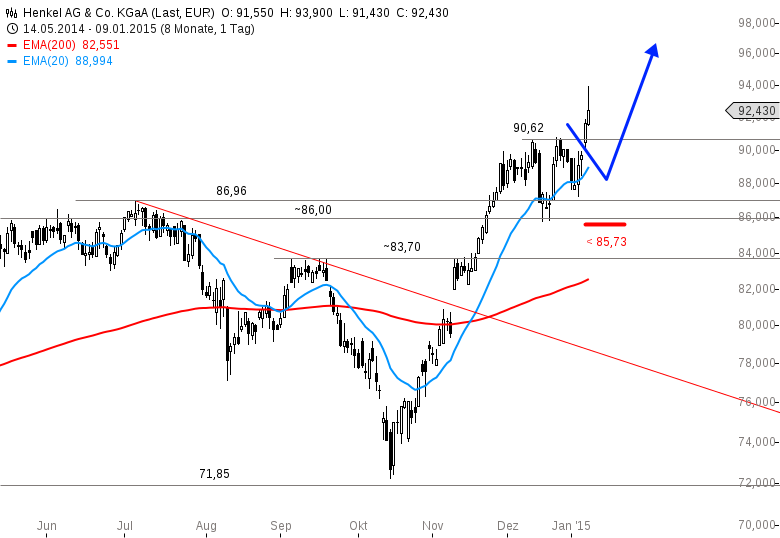 Henkel hat in den letzten Wochen eine kleine Outperformance hinlegen können, schließlich gelang es den Bullen bereits, die Jahreswiderstände aus 2014 relativ deutlich zu überwinden. Der Ausbruch über 86,96 Euro fand bereits am 27. November statt und konnte im Anschluss durch einen testenden Pullback von oben bestätigt werden. Das Tempo der Rally ab Mitte Oktober konnte dabei zu letzt aber nicht gehalten werden. Stattdessen kam es nach dem Ausbruch zu einer Konsolidierungsphase auf hohem Niveau. Dabei blieb die Aktie aber im bullischen Bereich und konnte in der letzten Woche neue Hochs mit etwas mehr Druck erklimmen. Der Trend ist stabil nach oben gerichtet und dies wiederum könnte bald zu dreistelligen Notierungen in Henkel führen. Nur unter 85,73 Euro sollte die Aktie jetzt möglichst nicht mehr zurückfallen.
