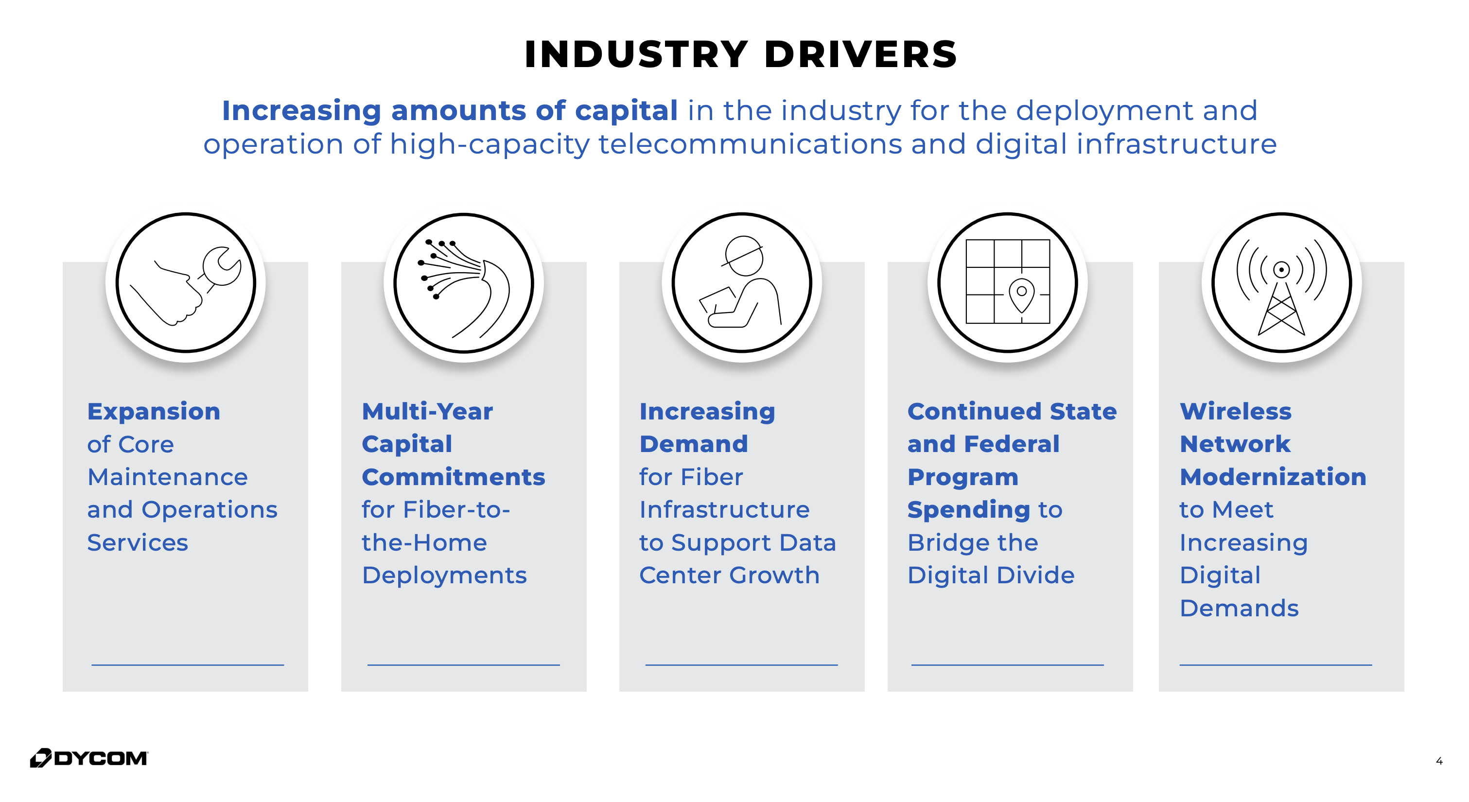 Dycom baut, erweitert und wartet Telekom‑Netze in den USA: Glasfaser in Straßen und Häuser, Funkstandorte, Kabel- und Versorgungsleitungen. Vor allem im Auftrag großer Carrier, Kabelnetzbetreiber und Versorger. Quasi so wie Ciena kommen sie aus dem Telco-Sektor. Geld verdienen sie, indem sie diese Projekte als Dienstleister planen, bauen und über langfristige Rahmenverträge betreiben; die Erlöse kommen also aus Bau- und Serviceaufträgen.