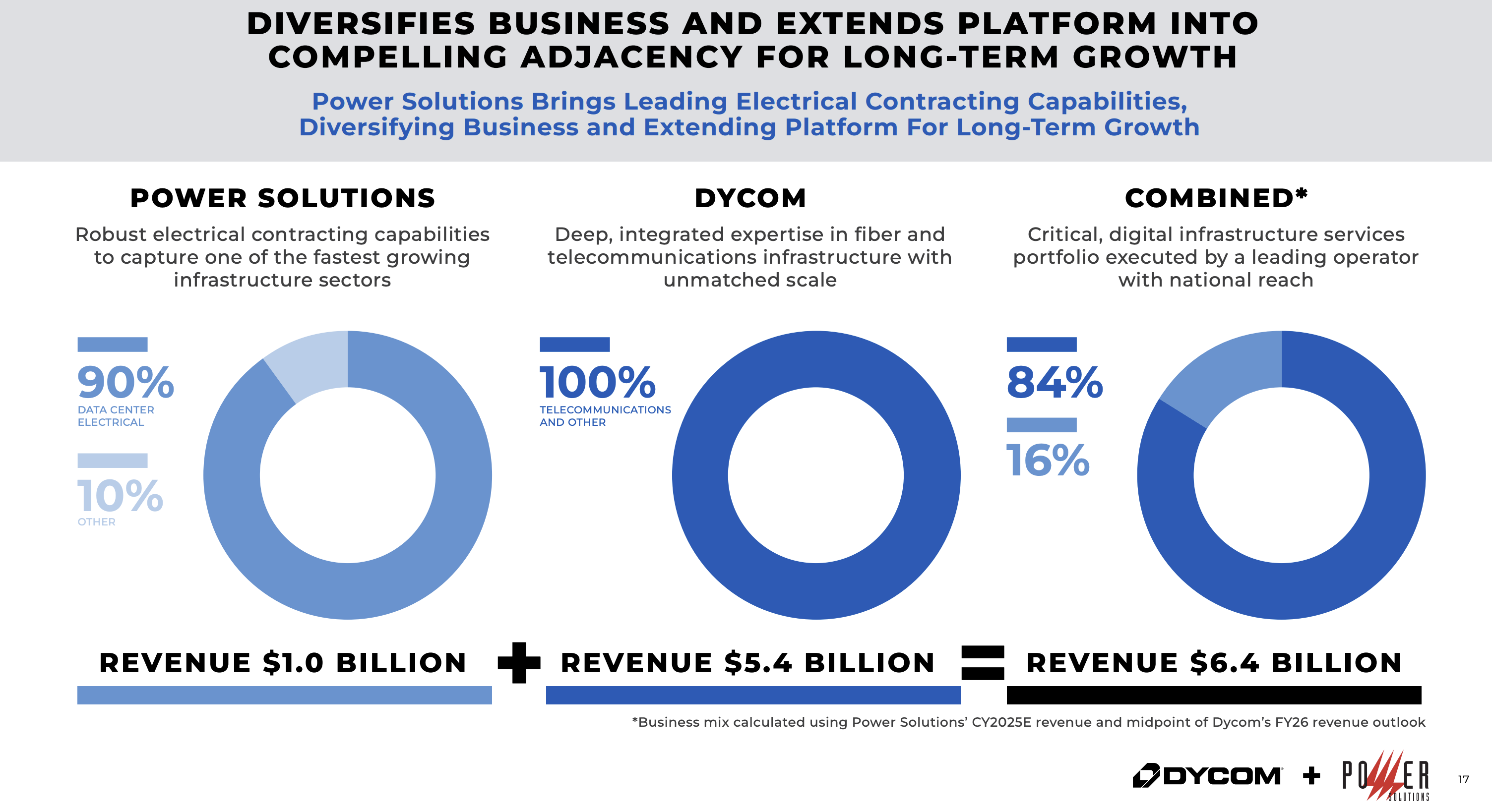 Dycom kauft Power Solutions für 1,95 Milliarden Dollar. Rund 293 Millionen werden in Dycom-Aktien bezahlt, der Rest in Cash. Power Solutions setzt etwa 90 % seines Umsatzes mit Rechenzentren um. Für 2025 wird der Umsatz auf rund 1 Milliarde Dollar geschätzt, mit einer durchschnittlichen Wachstumsrate von 15 % pro Jahr seit 2020. Die Adjusted-EBITDA-Margen liegen im mittleren bis hohen Zehnerbereich. Dycom kalkuliert mögliche Synergien weder im Kaufpreis noch in der Guidance ein, was Spielraum nach oben lässt.