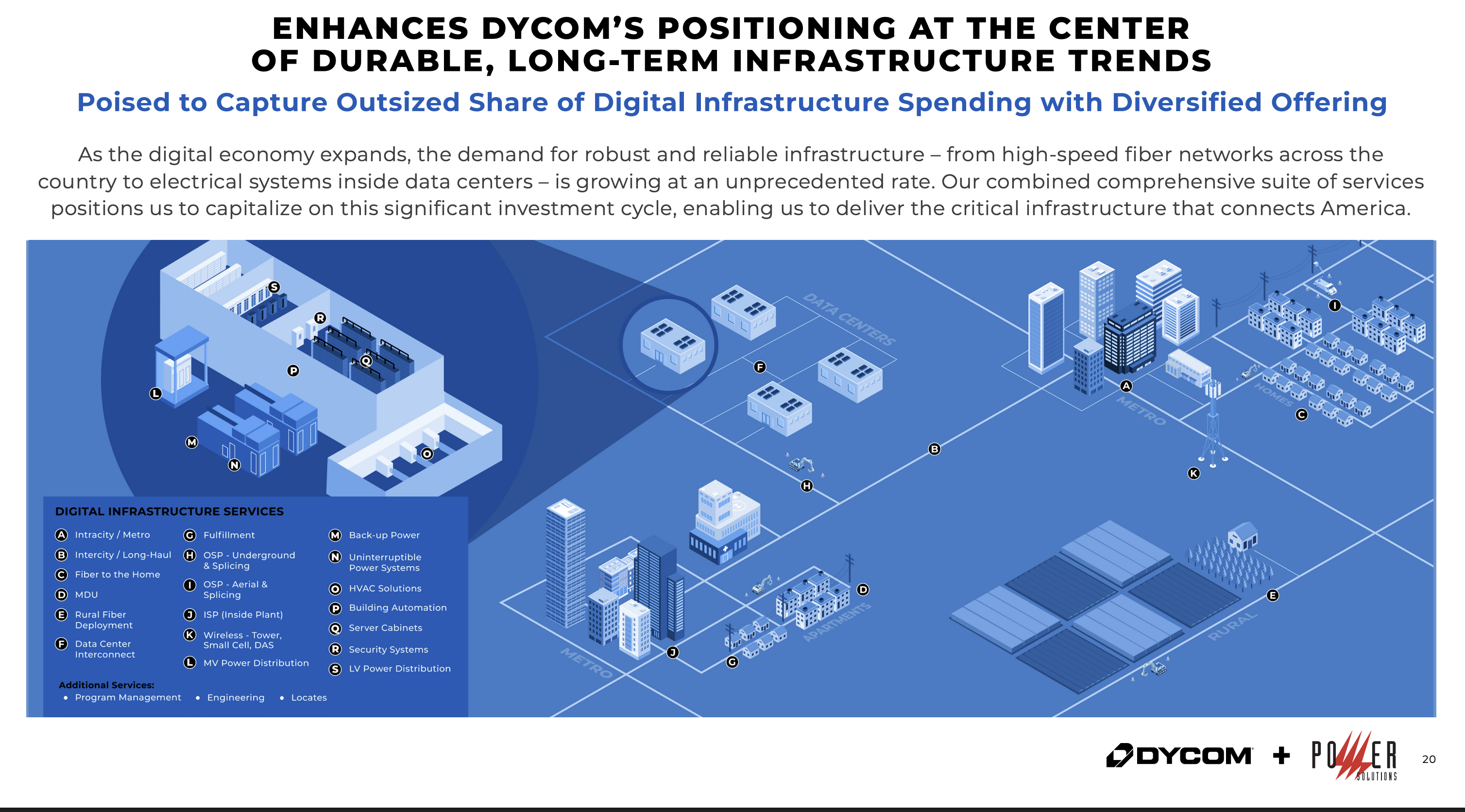 Von KI profitiert Dycom, weil dafür riesige Rechenzentren und extrem leistungsfähige Datenleitungen gebraucht werden. Genau diese Glasfasertrassen und die elektrische Infrastruktur in und zu den Datenzentren baut Dycom zunehmend, insbesondere nach der Übernahme von Power Solutions.