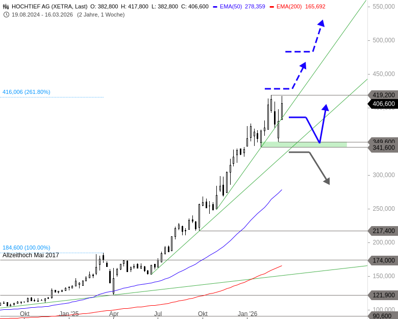 Nach einer breiten Bodenbildung startete Ende 2022 ein streckenweise exponentieller Aufwärtstrend, der das Allzeithoch aus dem Mai 2017 bei 174 EUR zu Beginn des vergangenen Jahres überwand. Es folgte ein kurzer, aber scharfer Einbruch auf 121,90 EUR. Seither dominiert ein Anstieg, der die vorherige Rallyphase sogar noch deutlich in Sachen Dynamik und Beschleunigung übertrumpft. Das Ende Februar bei 419,20 EUR erreichte neue Rekordhoch wurde nach einer kurzen Zwischenkorrektur in den letzten Tagen wieder angesteuert. Lohnt sich der Einstieg noch?