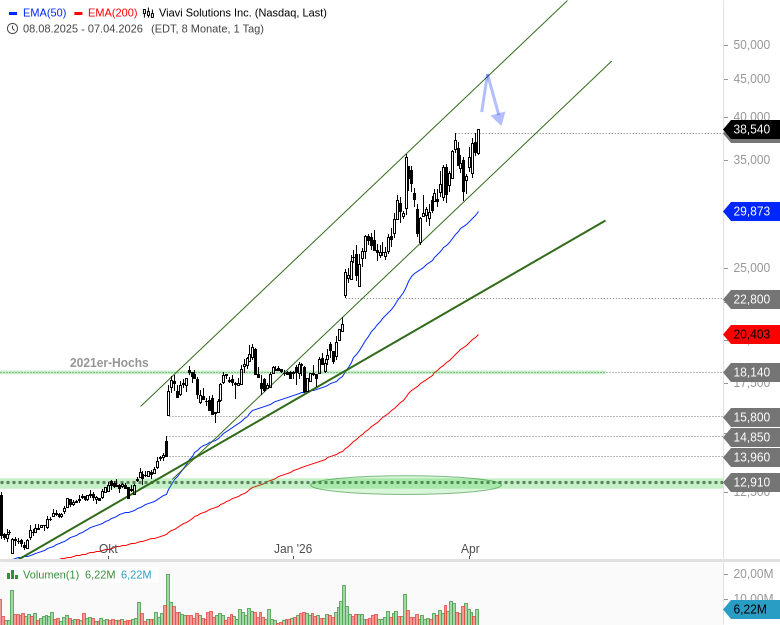 Die Momentum-Rally ist intakt, wobei zuletzt die Aufwärtsdynamik abgenommen hat. Gewinnmitnahmen erscheinen ab jetzt sinnvoll bei der Viavi-Solutions-Aktie, spätestens an der Trendkanaloberkante bei 45 - 47 USD erhöht sich die Gefahr kleinerer oder größerer Zwischenkorrekturen.