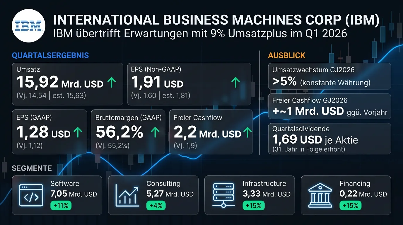 IBM hat im ersten Quartal 2026 einen Umsatz von 15,9 Mrd. USD erzielt und damit sowohl die Analystenerwartungen von 15,63 Mrd. USD als auch das Vorjahresniveau um 9 Prozent übertroffen. Das bereinigte Ergebnis je Aktie (Non-GAAP) stieg um 19 Prozent auf 1,91 USD und übertraf die Konsensschätzung von 1,81 USD deutlich, während das GAAP-EPS bei 1,28 USD lag (Vorjahr: 1,12 USD). Besonders stark wuchsen das Software-Segment mit 11 Prozent auf 7,1 Mrd. USD sowie die Infrastruktur-Sparte mit 15 Prozent auf 3,3 Mrd. USD, angetrieben von einem Anstieg der IBM-Z-Systeme um 51 Prozent. Der freie Cashflow legte um 0,3 Mrd. USD auf 2,2 Mrd. USD zu. Für das Gesamtjahr 2026 bekräftigte IBM die Prognose eines konstanten Währungsumsatzwachstums von mehr als 5 Prozent sowie eines freien Cashflow-Anstiegs von rund 1 Mrd. USD gegenüber dem Vorjahr.