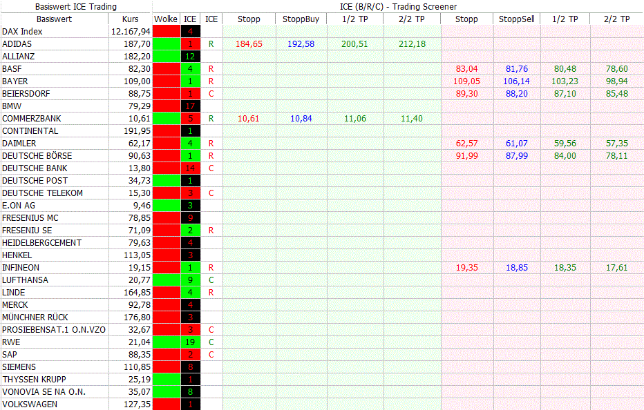 DAX Index & CO Screener - Die Trade Setups sind einfach der Tabelle zu entnehmen.