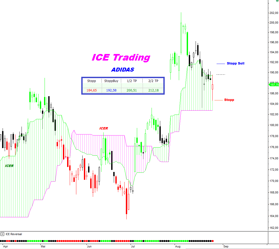 Die ADIDAS Aktie generiert ein ICE - Reversal Signal (ICE R).Rote Kerze bei grüner Wolke. Der Trade wird negiert, wenn der Stopp vor der Tradeaktivierung erreicht wird, oder die Wolke vorher auf rot wechselt.