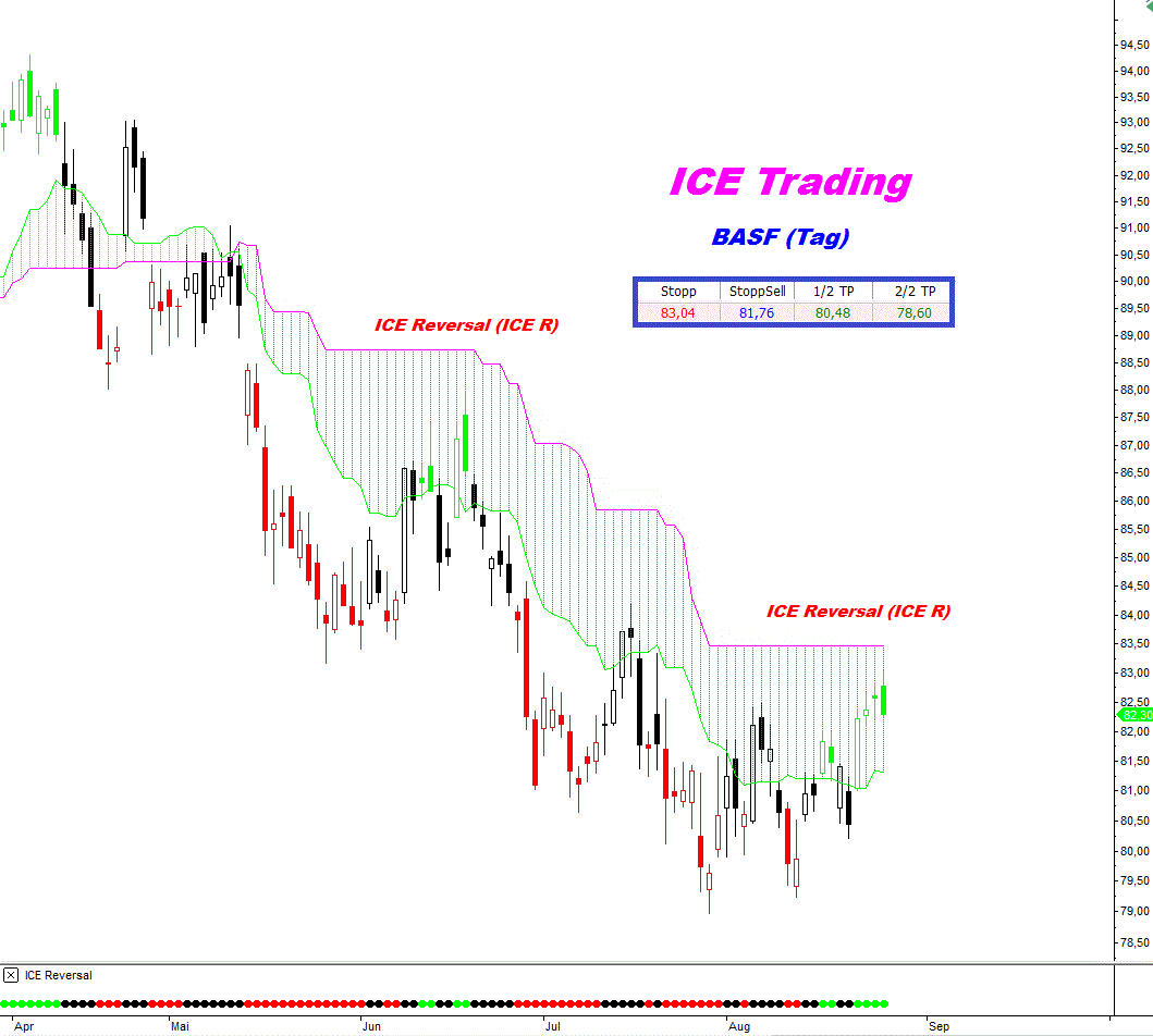 Die BASF Aktie generiert ein ICE - Continuation Signal (ICE C). Rote Kerze bei roter Wolke. Der Trade wird negiert, wenn der Stopp vor der Tradeaktivierung erreicht wird, die Wolke vorher auf grün wechselt, oder die Tageskerze auf schwarz wechselt.