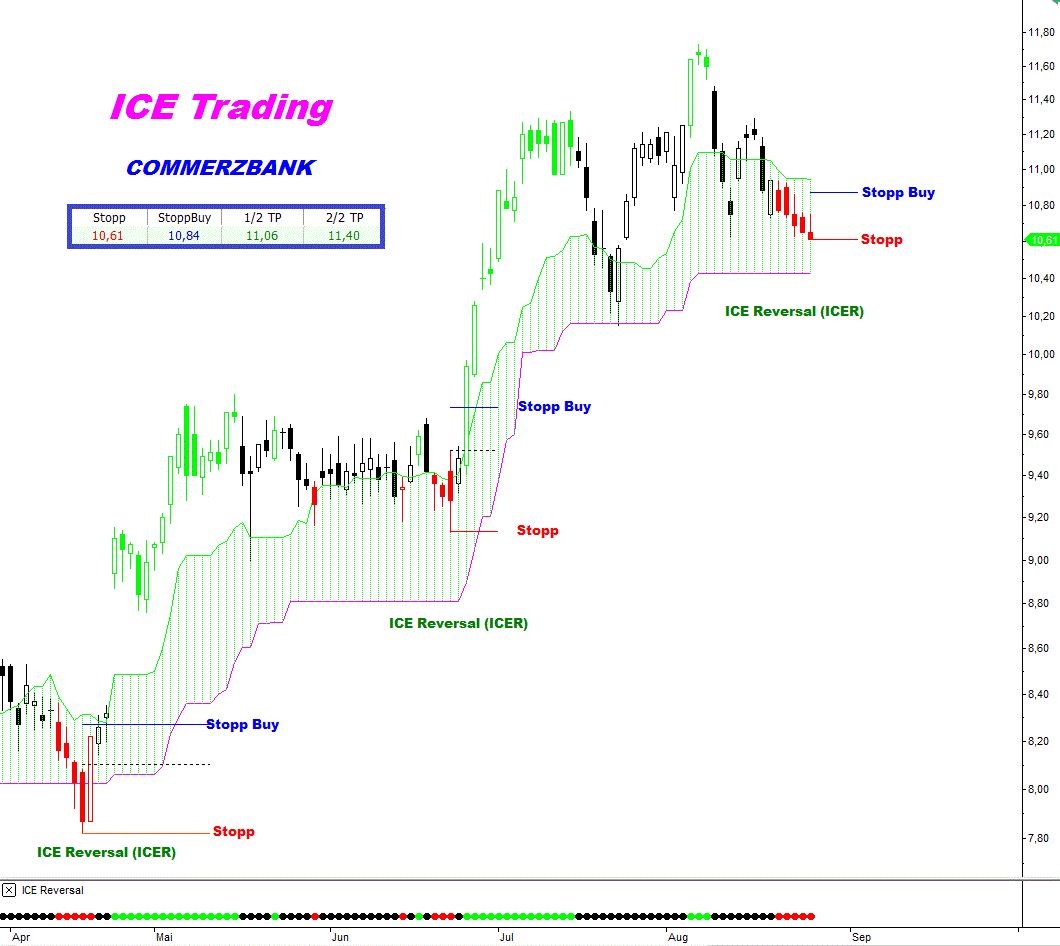 Die COMMERZBANK Aktie generiert ein ICE - Reversal Signal (ICE R).Rote Kerze bei grüner Wolke. Der Trade wird negiert, wenn der Stopp vor der Tradeaktivierung erreicht wird, oder die Wolke vorher auf rot wechselt.