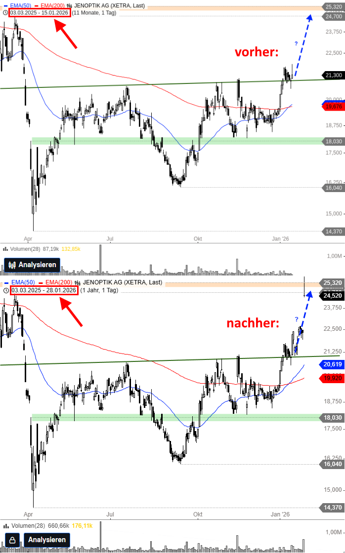 Zeitweise schoss die Jenoptik-Aktie heute um über 22 % nach oben, jetzt schrumpft das Plus auf etwas mehr als 9 % zusammen. Die Aktie trifft damit exakt den Zielbereich der letzten Analyse im Chart Tracker, der bei 24,70 - 25,30 EUR beziffert wurde. Darunter könnte es jetzt zu Konsolidierungen kommen, möglicherweise auch zum Schließen des heutigen Gaps.