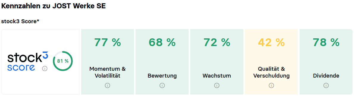 Fazit: Die starken Zahlen resultieren vor allem aus der Hyva-Übernahme, aber im vierten Quartal war auch das organische Wachstum beeindruckend. Im stock3 Score schneidet die Aktie der Jost Werke mit 81 % überdurchschnittlich gut ab und kann vor allem mit einem hohen Kursmomentum, einer attraktiven Dividende, dem starken Wachstum und einer moderaten Bewertung punkten.