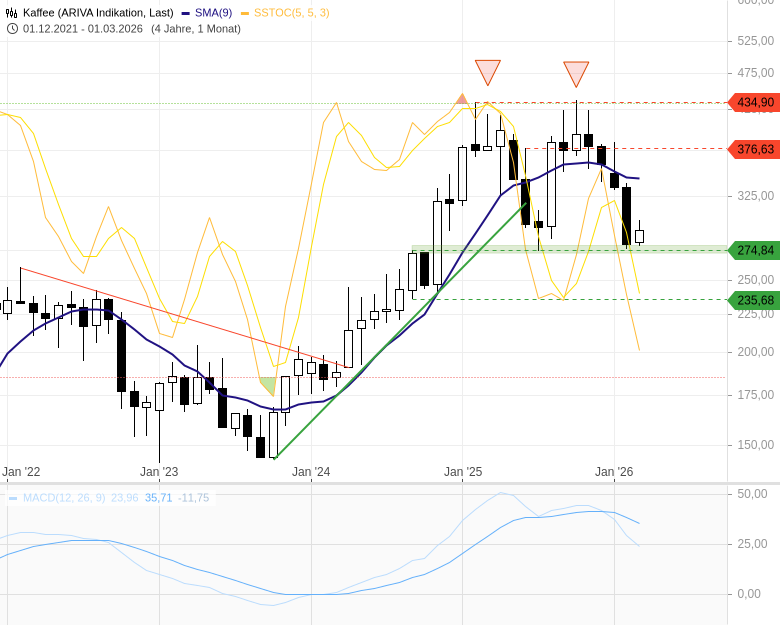 Auch aus charttechnischer Sicht wird es jetzt spannend. Denn der Kaffeepreis testet aktuell den Bereich um 275 USc je Pfund – eine wichtige Unterstützungszone!