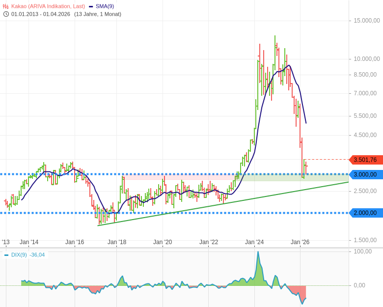 Ausgehend vom Allzeithoch bei 12.851 USD je Tonne im Dezember 2024 ging es zuletzt bis auf unter 3.000 USD. Damit hat der Agrarrohstoff fast 80 % an Wert verloren. Der zuvor extrem enge Markt hat sich innerhalb weniger Monate komplett gedreht.