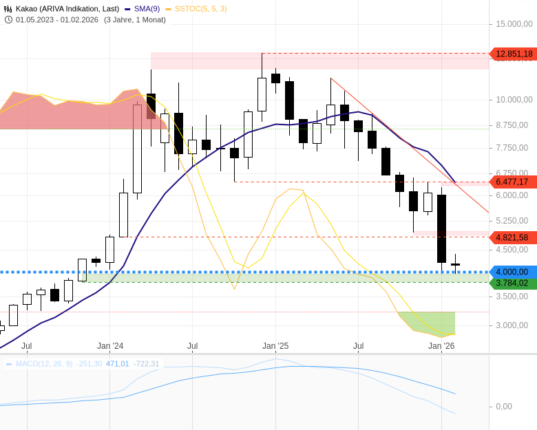 Charttechnisch zeigt sich ein äußerst angeschlagenes Bild. Vor allem im Monatschart befindet sich der Kakao-Preis weiterhin im freien Fall; die fallende 200-Tage-Linie unterstreicht den übergeordneten Abwärtstrend eindrucksvoll. Das bisherige Jahrestief liegt im Bereich um 3.950 bis 4.000 USD je Tonne. In diesem Bereich war zuletzt eine gewisse Stabilisierung zu beobachten. Von einer echten Trendwende kann jedoch keine Rede sein.