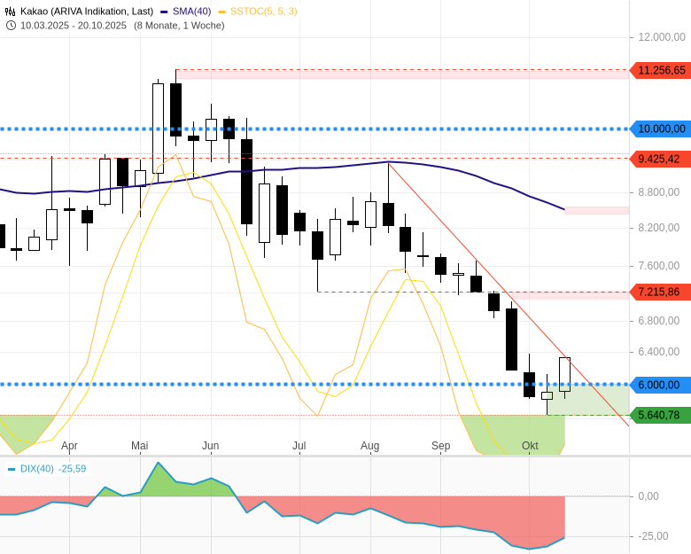 Doch seit Kurzem sendet der Markt wieder Lebenszeichen: In der Vorwoche fiel der Preis je Tonne Kakao bis auf 5.641 USD; den tiefsten Stand seit Februar 2024. Dabei durchbrach er sogar die wichtige 6.000er-Marke.