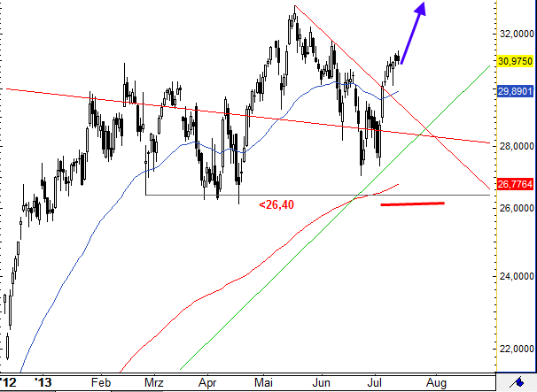 Die Aktie von KBC befindet sich in einer interessanten Ausgangssituation. Denn die Aktie befindet sich seit Monaten in einer Rally. Dabei kletterte sie auf ein Hoch bei 33,10 Euro am 22. Mai 2013. Nach diesem Hoch kam es noch einmal zu einem Rücksetzer. Am 08. Juli 2013 brach die Aktie aus dem zugehörigen Abwärtstrend nach oben aus. Dieser Ausbruch könnte zu einer weiteren Rally in Richtung 39,94 Euro führen. Sollte der Wert aber unter 26,40 Euro zurückfallen, könnte Verkaufsdruck aufkommen.
