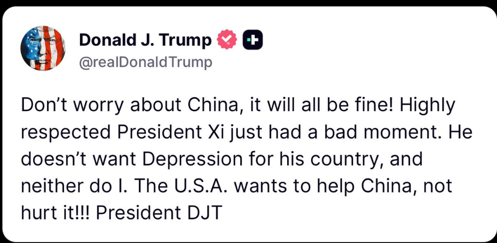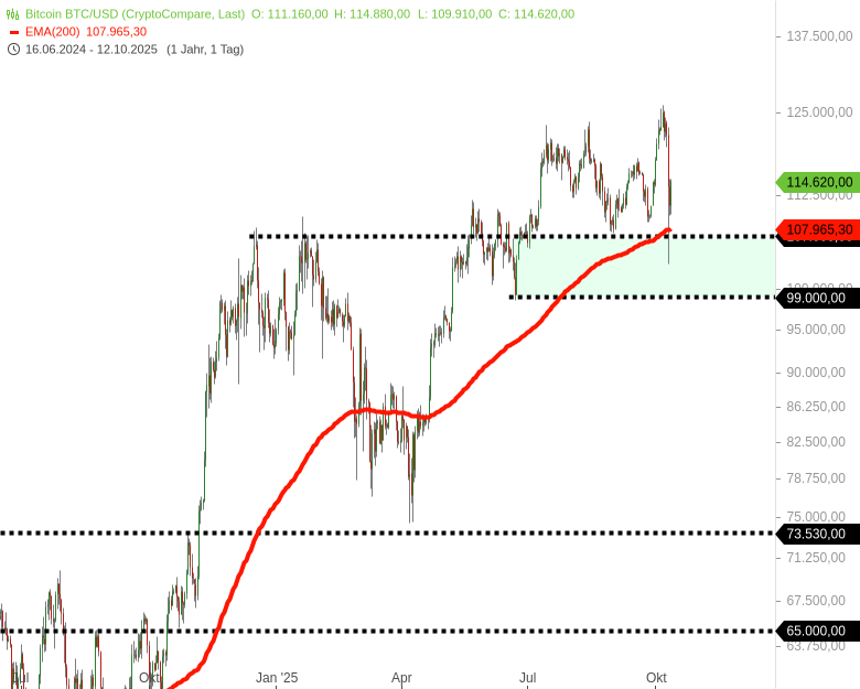 Die Kurse der Kryptowährungen als wichtige Risk Assets springen am späten Nachmittag wieder an. Deutlich. Das muss man ihm lassen, das macht Trump gut. Einerseits muss er stark auf Chinas "Seltene Erden"-Affront reagieren, deshalb diese 100% Zollansage vom Freitag, die die Märkte einbrechen ließ. Andererseits will er nicht haben, dass die Aktienmärkte abstürzen, also postet er heute beschwichtigend. Der Sachverhalt ist nach wie vor der: China hat die Exportbedingungen für Seltene Erden eingeschränkt (Bekanntmachung vom Donnerstag) vs Trumps 100% Zollansagen gegen China vom Freitag. Daran ändert sein beschwichtigender Post von heute nichts 🙂