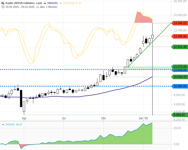 Zum einen signalisiert der Slow-Stochastik-Indikator eine klar überkaufte Marktsituation. Zum anderen notiert der Kupferpreis aktuell rund 25 % über seinem Durchschnitt der vergangenen 200 Handelstage. Dieser hohe Wert im DIX-Indikator unterstreicht diese Übertreibung. Rückblickend ist das eine sehr ambitionierte Größe. Kurz gesagt: Die Kupferpreisrally hat sich heißgelaufen. Immerhin legte der Tonnenpreis seit Jahresbeginn um bis zu 12 % zu.
