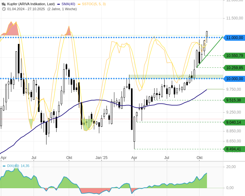 Der klare Profiteur dieser Gemengelage heißt Kupfer. Der Preis übersprang im Wochenverlauf die psychologisch und technisch bedeutsame Marke von 11.000 USD je Tonne und notiert aktuell bei rund 11.070 USD – einem neuen Allzeithoch!
