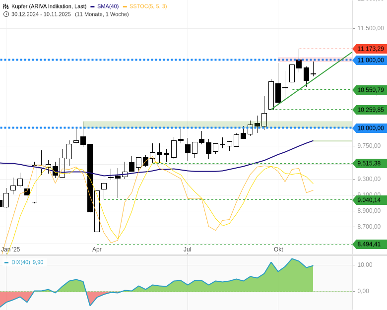Mein Fazit: Der Sprung über die 11.000-USD-Marke war für den Kupferpreis nur von kurzer Dauer. Solange der Preis zwischen 11.000 und 10.550 USD pendelt, bleibt Kupfer charttechnisch neutral. Erst ein klarer Ausbruch über den Widerstand oder ein Bruch der Unterstützung liefert neue Signale. Bis dahin bleibt Kupfer vor allem ein Spielfeld für kurzfristig orientierte Trader.