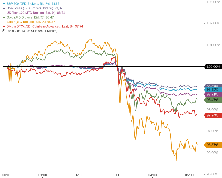 Die Kurse von Risk Assets gaben während und nach der Rede deutlich ab. -1,3% im Nasdaq Future, - 2,0% im Bitcoin. Insgesamt fallen Indexfutures, aber auch Edelmetalle. Alleine der Ölpreis steigt hochdynamisch an, +5% im US-Leichtöl (WTI).
