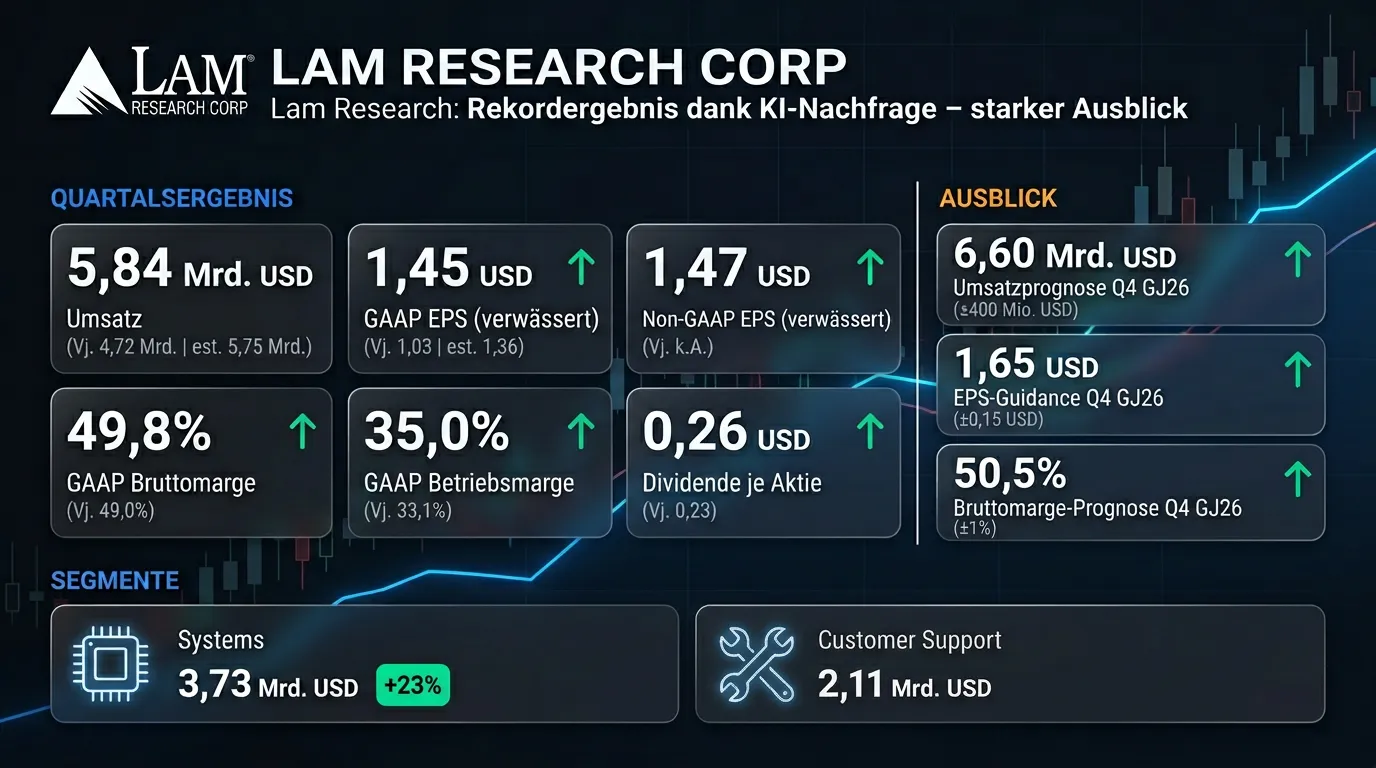 Lam Research hat im dritten Quartal des Geschäftsjahres 2026 (Ende 29. März) einen Rekordumsatz von 5,84 Mrd. USD erzielt und damit die Analystenerwartungen von 5,75 Mrd. USD übertroffen. Der Umsatz stieg gegenüber dem Vorjahresquartal (4,72 Mrd. USD) um rund 24 Prozent, das verwässerte GAAP-EPS verbesserte sich von 1,03 auf 1,45 USD und übertraf den Konsens von 1,36 USD deutlich. CEO Tim Archer führte die Rekordergebnisse auf die durch KI getriebene Nachfragedynamik in der Halbleiterindustrie zurück. Für das laufende Quartal (Ende 28. Juni 2026) erwartet Lam Research einen weiteren deutlichen Umsatzanstieg auf 6,60 Mrd. USD (±400 Mio. USD) sowie ein verwässertes EPS von 1,65 USD (±0,15 USD).