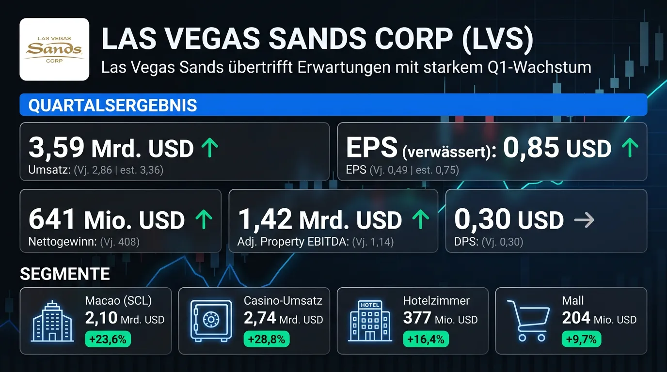 Las Vegas Sands (LVS) hat im ersten Quartal 2026 einen Umsatz von 3,59 Mrd. USD erzielt und damit sowohl die Analystenprognose von 3,36 Mrd. USD als auch den Vorjahreswert von 2,86 Mrd. USD deutlich übertroffen. Der Nettogewinn stieg um 57,1 Prozent auf 641 Mio. USD, während das verwässerte Ergebnis je Aktie mit 0,85 USD die Konsensschätzung von 0,75 USD klar schlug. Das bereinigte EBITDA der Immobilien legte um 24,6 Prozent auf 1,42 Mrd. USD zu, getragen von Wachstum in beiden Kernmärkten Singapur und Macao. Im Berichtszeitraum kaufte LVS eigene Aktien im Wert von 740 Mio. USD zurück und zahlt weiterhin eine vierteljährliche Dividende von 0,30 USD je Aktie.