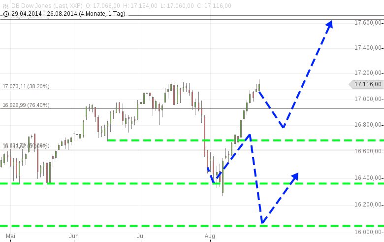 Der DOW Jones ist noch nicht auf ein neues Allzeithoch ausgebrochen. Das nächste Kursziel liegt bei 17.660 Punkten.