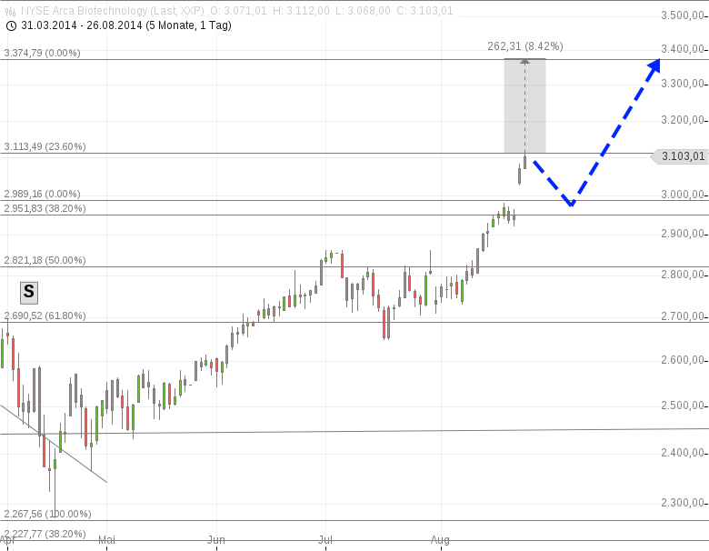 Das Kursgeschehen im US Biotechnologiesektor zeigt eine Hausse sondergleichen. Ich möchte jetzt nicht auf die folgende SIgnallage eingehen. Nur soviel. In dieser Woche wurde erneut ein Aufwärtsimpuls gestartet. Dieser hat Potential bis 3.375 Punkte.