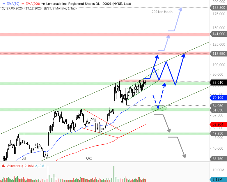 Fazit: Die Lemonade-Aktie ist ein charttechnischer Leckerbissen und bewegt sich seit Monaten in sehr sauberen Mustern. Diese würden eine Trendfortsetzung gen Norden und ggf. sogar eine Rallybeschleunigung hergeben. Die Aktie notiert jetzt am Trigger, prozyklisch könnte ein Ausbruch nach oben hin Chancen bieten.
