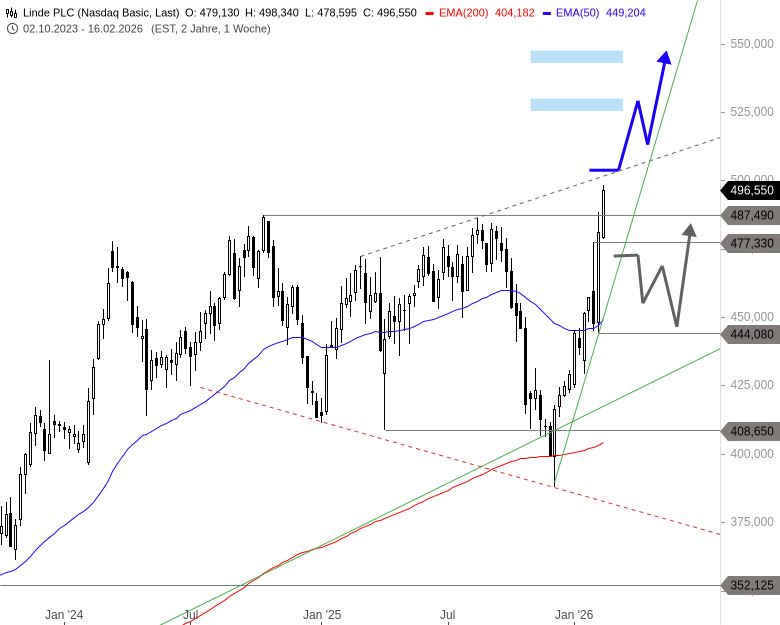 Charttechnisches Fazit: Der Ausbruch über das Allzeithoch bei 487,49 USD könnte mit einem Anstieg über 505 USD bestätigt werden und die Aktie von Linde bis 525 USD und 545 USD antreiben. Oberhalb von 477,33 USD, dem Hoch von Anfang Februar, wären weitere Kaufwellen nur eine Frage der Zeit.