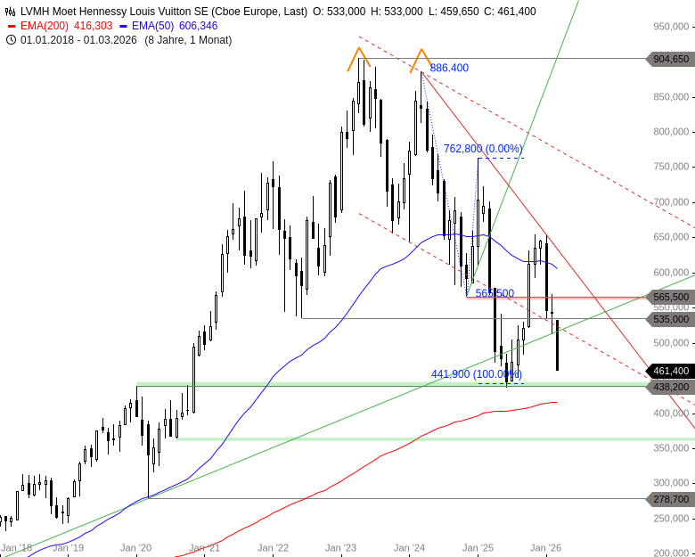 Der Versuch der Anleger, bei der Aktie von LVMH den übergeordneten, seit 2023 dominierenden Abwärtstrend zu verlassen, endete mit einem Doppeltop bei 654 EUR. Nach der Vollendung dieses bärischen Trendwendemusters und dem gescheiterten Ausbruchsversuch über die übergeordnete Abwärtstrendlinie fällt der Kurs seit Januar dynamisch ab.