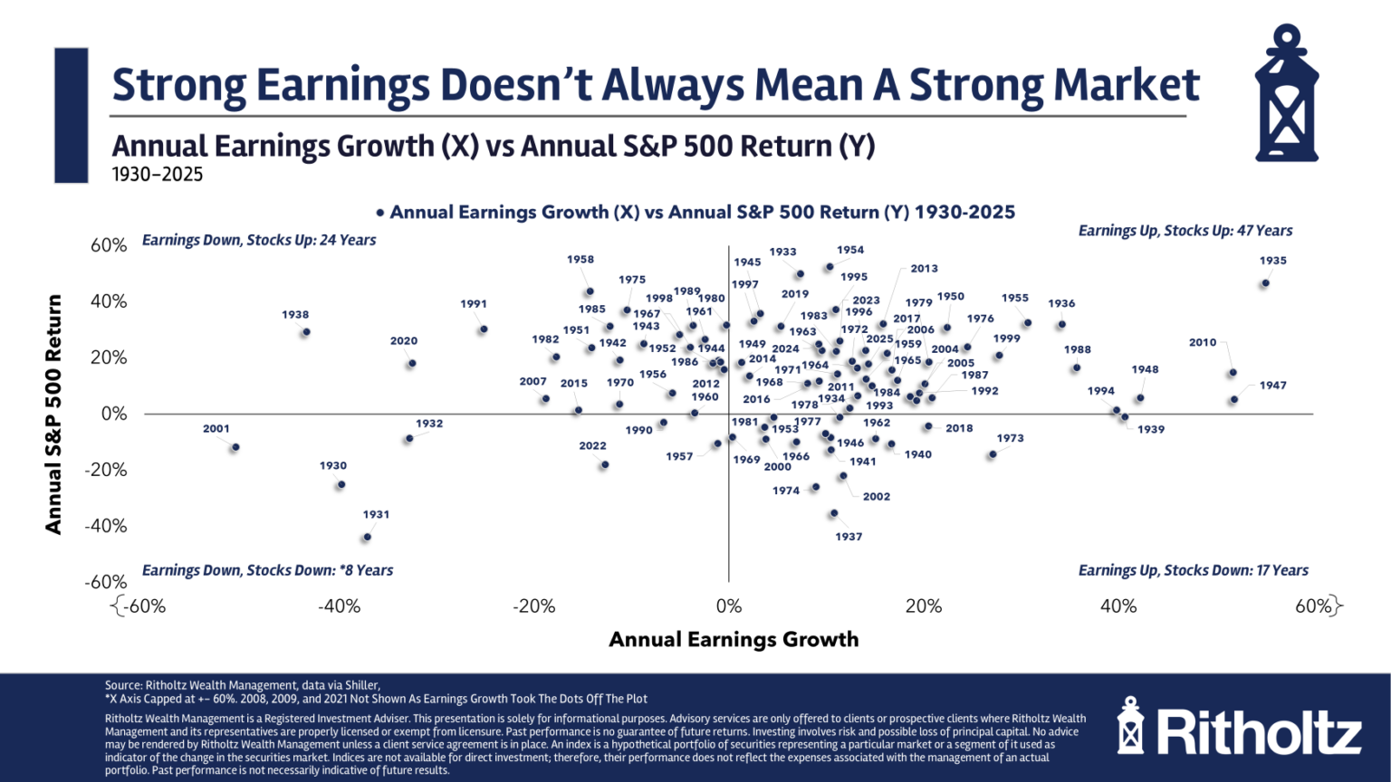 Der Scatter Plot zeigt alle Jahre seit 1930 nach Earnings Growth (x-Achse) und S&P 500 Rendite (y-Achse). Vier Quadranten entstehen.