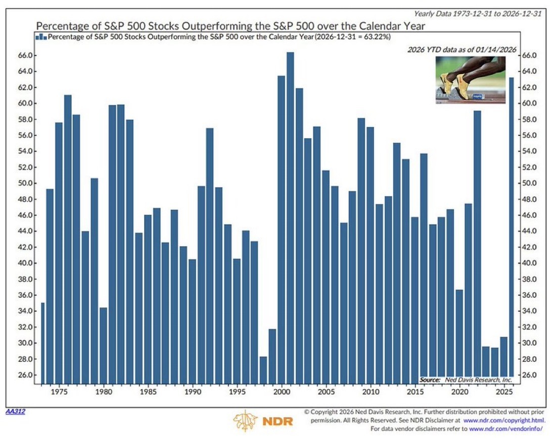 63,22 % der S&P 500 Aktien schlagen den Index 2026 YTD (Stand 14. Januar). Das ist der höchste Wert seit 2001, als 66 % outperformten, und der zweithöchste seit Beginn der Aufzeichnungen 1973. Aber Kontext zählt. 2001 war kein gutes Jahr. Der S&P 500 fiel damals um -11,9 %, trotz breiter Outperformance. Viele Aktien stiegen, während Tech-Giganten kollabierten und den Index nach unten zogen. Breite bedeutet nicht automatisch Indexstärke. Sie zeigt, dass Gewinne diversifiziert sind, nicht konzentriert. Das kann bullisch sein, wenn der Index steigt. Es kann aber auch bedeuten, dass die größten Positionen schwächeln und kleinere Titel die Lücke füllen, ohne den Gesamtindex zu retten.